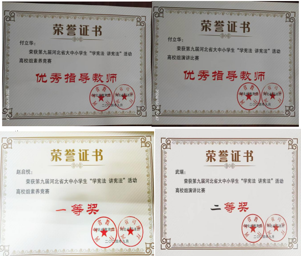 素养竞赛分初赛决赛两个环节,全面考察选手对习近平法治思想以及宪法法治知识的理解和掌握。初赛采取笔试方式,95名高校参赛者8名晋级决赛,赵启悦晋级;决赛中,经单选题、多选题、逻辑题、判断题、抢答题五轮激烈角逐,赵启悦最终获得高校组素养竞赛一等奖。在演讲比赛中,武瑞以《宪法守护,守护宪法》为题,开篇为大家讲述了视障人士董丽娜的维权之路,并结合大学期间参加的宪法实践活动,进一步阐述了宪法的力量。最后,武瑞讲述了我国第一部宪法修订的故事,带领大家一起致敬为我国宪法做出卓越贡献的前辈们,并表达了作为一名法学生守护宪法的决心,经过河北省百余名选手激烈角逐,武瑞获得高校组素养竞赛二等奖。