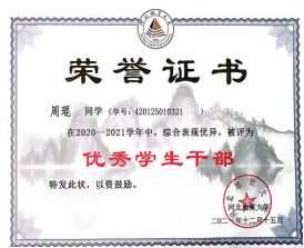 青年志愿者协会,积极参与社团活动及志愿服务,获得河北慈善联合基金会颁发的荣誉证书。