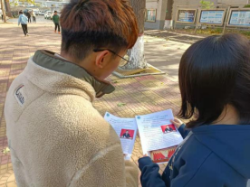 惠馨园甬道上人流如织,往来熙熙攘攘,宣讲场地前热闹非凡。宣讲同学手持宣传页从“一个决定、两个确立、三个确认、五大历史意义、十个坚持”等方面向在场师生就十九届六中全会的历史意义、主要内容、时代价值进行说明讲解。宣讲同学将会议内容要点与实际案例结合讲述,以河北省阜平县多措并举进行产业升级,推动乡村振兴,实现全县脱贫为例,动情地描述了近些年来自己身边发生的显著变化,引起在场师生们的强烈共鸣。