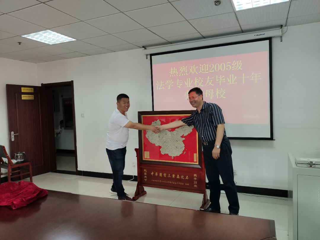 为表达对母校的感恩之情,2005级法学专业的校友们向母校赠送了中国地图的三叶虫化石以及校训“达观博物”毛笔字,这寄托着对母校明天更美好的祝愿,表达了广大校友的心声。座谈会结束后,校友们与老师在学校门口合影留念。短短的一天时间,不足以将校园的每处走遍,不足回忆起曾经大学的点点滴滴,但相信这一天会成为校友们一生里最难忘的记忆,也期待再次相聚。