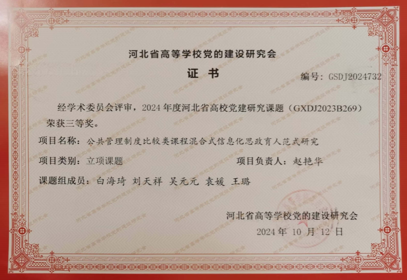 日前,河北省高等学校党的建设研究会公布了2024年河北省高校党建课题评审结果,黄色网站大全 的“公共管理制度比较类课程混合式信息化思政育人范式研究”(GXDJ2023B269)课题获评三等奖。