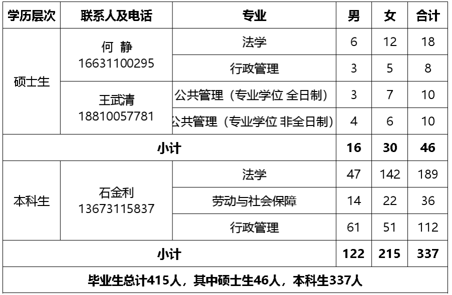 成立于2012年4月,法学专业的招生源于1994年设立的经济法专业(1999年更名为法学专业);行政管理专业1999年开始招收本科生;劳动与社会保障专业2003年开始招收本科生。